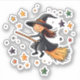 A cute witch flies on her magic broom surrounded by colorful stars. This fun sticker is perfect for celebrating Halloween.