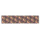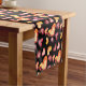Table runner displaying a pattern of hand drawn and digitally designed, orange, pink, red, purple, yellow, foil textured, plaid hearts on a black background.