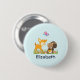 Personalized button with a cute illustration featuring a baby deer and a little squirrel holding an acorn and a butterfly flying above their heads. These adorable woodland creatures on standing on some grass with some whimsical mushrooms by their feet. Light blue background.
