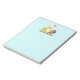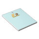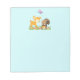 A notepad with a cute illustration featuring a baby deer and a little squirrel holding an acorn and a butterfly flying above their heads. These adorable woodland creatures on standing on some grass with some whimsical mushrooms by their feet. Light blue background.