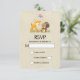 An RSVP card with a cute illustration featuring a baby deer and a little squirrel holding an acorn and a butterfly flying above their heads. These adorable woodland creatures on standing on some grass with some whimsical mushrooms by their feet. Sandy brown background.