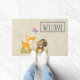 Welcome door mat with a cute illustration featuring a baby deer and a little squirrel holding an acorn and a butterfly flying above their heads. These adorable woodland creatures on standing on some grass with some whimsical mushrooms by their feet. Sandy brown background.