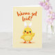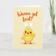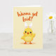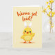 This card shows a cute, stylized baby chick in sunny yellow with warm orange shading, sitting low in the frame with big black eyes and rosy cheeks that give it a sweet, friendly look. One little wing is lifted as if it’s waving hello to someone special, adding a gentle, companionable tone. On its head sits a white headband with tall bunny ears 🐰, like a costume detail that makes the character look ready for a spring celebration. Across the upper area, a short question is written in a flowing, handwritten-style font in bright orange, centered above the chick. The background is a creamy pale yellow with softly glowing circles scattered around, like light bokeh floating behind the scene 🌷. The chick’s small orange feet are visible near the bottom edge, anchoring it while the lifted wing leans slightly toward the viewer. Soft shading and smooth outlines keep the shapes rounded and tender, and the pale circles fade gently into the warm backdrop. The orange lettering sits clearly at the top, while the chick and its white bunny ears stand out against the buttery yellow field.