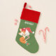 Here's a cute personalized Holiday stocking that your child will love! The front features a little brown fox wearing a red and white snowflake pattern stocking cap and a red bow. The fox has been caught with a red and white striped candy cane, and a sprig of holly with red berries is near its tail. Your custom text is in white above the image. The image and text are placed on a Holiday green background.
