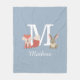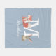 Cute blue fleece blanket featuring a woodland forest baby fox cub and bunny rabbit sitting either side of the monogram and name. Designed by Thisisnotme©