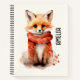 Spiral notebook with an illustration of a reddish orange fox pup. A subtle smile on his face. Wearing a nice red scarf for warmth.