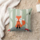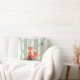 Cute and fun pillow featuring a cartoon illustration of a little fox sitting on a rock in the forest. Beside him are colorful mushrooms and a little bird is peeking out from a nest in one of the trees. Illustration by Mhea.