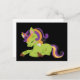 A postcard with an image of a Frankenstein unicorn. Purple and green colors. Spooky cute.