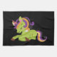 A kitchen towel with an image of a Frankenstein style unicorn. Purple and green colors. Spooky cute.