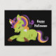 A postcard with an image of a Frankenstein unicorn. Purple and green colors. Spooky cute.