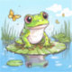 Frog themed sticker. Adorable toad or frog sitting on a lily pad surrounded by butterflies with his reflection in the water. Adorable cartoon frog in a comic book style.