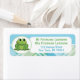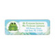 Cute frog blue and green plaid address labels, exclusively designed by Artistically Invited, with an adorable green frog in a white oval outlined in green, with your personalized name and return address in green and blue in a white rounded rectangle, over a background with blue on the top and a blue and green plaid pattern on the bottom. The name(s) are printed in green, 1 point larger than the address, which is printed in blue.