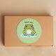A green sticker with an illustration of a cute frog on its pond and customizable text above! You can customize it with a birthday message to add to your gifts for kids or a Thank-You text to stick to a favor box!