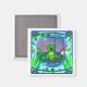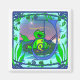 The Letter J, Ornamental / Illuminated Initial, has a cute frog sitting on a lily pad and is watching the magic of nature as the sun sets and the small wavelets lap quietly to shore. There is a dark blue ornamental frame with green vines and leaves over a turquoise background surrounding the frog image with dragonflies darting into the scene; The large decorative letter J is in dark blue and touches the top of the decorative frame to the bottom.