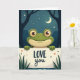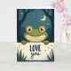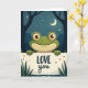 This card shows a cute green frog with big, wide brown eyes looking straight at you with a gentle, hopeful expression 🥰. It’s holding up a creamy white banner above its head. On the banner, the text reads “LOVE you” in dark, flowing cursive-style letters, with a few small orange hearts and tiny blue stars scattered around the words. Behind the frog is a nighttime scene with a deep teal sky filled with little white stars and a pale crescent moon. Dark tree shapes frame the background, and dark green reeds rise along the bottom edge, hinting at a quiet pond or swamp. The simple scene feels calm and caring, like a small reminder that someone is thinking of you. It’s a sweet choice for romance or close friendship, especially when you want your message to feel honest and comforting ❤️.