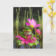 Cute AI art depicting a cute frog or toad sitting on a branch of pink flowers with a swamp background. Funny frog and toad pun birthday card.