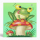 Cute hungry little green froggy frog sitting on a colorful spotted toadstool/wild mushroom licking his froggy lips for a nearby fly. So cute and cartoony!