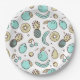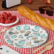 Paper plates with a cute fruit pattern line drawing style. Light green and yellow colors. A fun summery design.