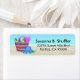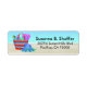A fun illustration of a beach bag sitting on the sand with a blue hat resting next to it. The background is a sandy beach with pretty blue ocean waters. Personalize this beachy cheerful label with your name and address.