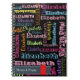 Cute Colorful Custom Personalized Your First Name Pattern on Black spiral notebook. Features pink blue, green, hot pink, purple, yellow, orange color font pattern on black color background. Great, fun, feminine, girly design.