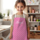 Cute kids' apron featuring a two-tone pattern of light pink polka dots on a darker pink background. Personalize it with your child's name in a fun white curlicue font.