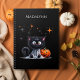 Cute Funny Black Kitten Halloween notebook. A fun and spooky trick-or-treat trivet featuring a wide-eyed, cute yet scary kitten wearing a sheer ghost costume! The playful kitten's eerie expression and whimsical outfit add a touch of Halloween charm. Easy to add your name in space provided.