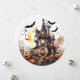 Cute watercolor Halloween card featuring a haunted house, funny pumpkins and bats. Easily personalize this beautiful Halloween card with your family name.