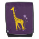 Funny giraffe backpack with a cartoon giraffe nibbling on a light purple flower and holding some flowers with its tail while roller skating, on dark purple background. This cute giraffe design will appeal to girls who love giraffes and cute cartoon illustrations, as well as the purple color. It will make a great gift for a skater girl, too.