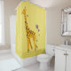 Funny giraffe shower curtain with a cartoon giraffe nibbling on a light purple flower and holding some flowers with its tail while roller skating, on yellow background. This cute giraffe shower curtain will appeal to girls who love giraffes and cute cartoon illustrations, as well as the cool yellow. It will make a great gift for a skater girl, too.