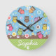 Cute funny trendy owls and flowers pattern, hot pink, bubble gum pink, light blue, bright green, soft purple, soft yellow, orange, dark and lighter brown, white colours, light blue background, soft brown ribbon, faded hearts green pattern, personalize your name or favourite words. Image print
