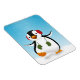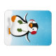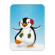 A cute winter illustration featuring a clumsy penguin in a good mood wearing gloves and earmuffs walking in the snow.