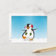 A cute winter illustration: a penguin with gloves and earflap in a good mood is walking in the snow.