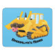 This funny yellow bulldozer eats dirt! Drawn in happy cartoon illustration style with tongue and eyes to create a cute character for the budding construction worker!