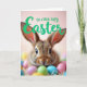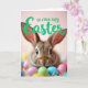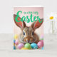 This greeting card features a small bunny 🐰 centered in a close-up portrait, with tawny-brown fur, tall ears, and wide dark eyes that seem to hold a tender, friendly gaze toward the viewer. Soft, diffused lighting adds a gentle glow, and the pale pink background keeps the focus on the bunny’s face and pink nose with fine whiskers. Around the lower edge, pastel oval shapes in spring green, baby blue, and soft pink sit like a cozy border on light, textured fibers, suggesting a sweet little scene set for sharing. The shallow blur around the edges makes the bunny feel even closer, like a quiet moment you’d share with someone you care about 🐇. At the top, emerald-green lettering places the word “Easter” large in the upper center, with “FOR A SPECIAL HAPPY” arranged above it in smaller text. The green text stands out clearly against the pink background without crowding the bunny’s ears. The bottom border shows smooth, shiny pastel ovals nestled on pale, fuzzy strands beneath the bunny’s chin.