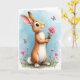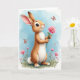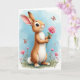 This card features a long-eared bunny standing upright in a spring meadow, its tawny brown fur fading into a soft white belly as it hugs a bouquet close like a shy gift for a dear friend 🐰. Pink blossoms scatter through the green grass, and the bunny’s small paws curl around fuchsia flowers with tiny golden centers. Its large, dark eyes lift toward the sky, with long lashes and a tender, daydreaming look that suggests it’s thinking of someone special. A few butterflies drift overhead, their wings tinted in pink and warm terracotta, adding gentle motion to the calm scene 🐇. Soft, diffused light smooths the colors and gives the fur and petals a cozy, almost touchable look. The greeting text sits near the top in a light, pastel tone, leaving the illustration to fill most of the front. Behind everything, a pale blue sky with faint, brushy texture and soft clouds frames the bunny and butterflies.
