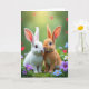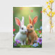 This card features two fluffy rabbits 🐰 at the center, one snowy white and the other a warm ginger tone, posed close enough that their noses nearly meet in a tender, friendly pause. Their large, dark eyes catch tiny highlights, and their relaxed posture suggests quiet affection without needing any extra drama. Behind them, a rich green garden setting glows with soft light filtering from above, giving the scene a gentle springtime hush. Faint red heart shapes hover in the background as blurred accents, adding a romantic touch while keeping the focus on the pair. Along the lower area, small flowers in lavender, white, and sky-blue dot the greenery like a natural frame, with a few petals seeming to point the eye back toward the rabbits 🌷. A short Easter greeting sits near the top in a light-colored font that stands out against the greenery, with a smaller line of text placed beneath it in a softer shade. Fine details show in the rabbits’ whiskers, the velvety texture of their fur, and the slightly translucent edges of their ears lit by the overhead glow. The foreground is layered with lush green leaves and scattered pastel blossoms around their paws, while the red hearts remain softly out of focus behind them.