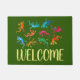 Welcome mat with colorful geckos cute lizards original Australian art illustration by artist Sacha Grossel featuring these cute reptiles on an eco green simple natural background. Colorful and vibrant.