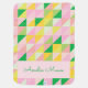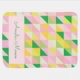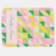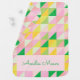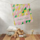 This personalized name baby blanket features a cute geometric patchwork pattern of little triangles forming a classic quilt design in a modern palette of spring colors including pink, green, and yellow. Great for Easter too!