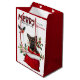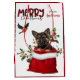 The image on both front and back of this Christmas gift bag is an image of an adorable German Shepherd puppy peeking out from a Holiday gift bag. Behind him is a sprig of holly and red berries. A red and black bullfinch bird is about to land. Stylized red and black buffalo plaid text says MERRY CHRISTMAS". Your own signature is in two fields for you to customize. Be sure to see the matching products, including ornaments, in our store.
