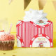 This custom wrapping paper features a festive Christmas theme. An image of a cute illustrated gingerbread man is placed in the center of a peppermint circle. A Merry Christmas greeting is printed above the gingerbread man with the word "Merry" printed in a gold glitter pattern, and "Christmas" printed in a red and white striped candy cane pattern. A sample name is printed below the gingerbread man which you can personalize to include your own custom name or text. The background features a red and white pinstripe design.