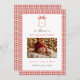 A charming gender neutral photo birth announcement card featuring a red and white gingham border and a monogrammed crest. A sweet red bow adds a touch of elegance.