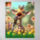 Cute Giraffe singing with mic in garden of flowers Poster