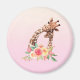 A magnet with a cute drawing in watercolors of a mom and baby giraffe. The mother giraffe is resting her head on top of the baby giraffe, loving and adorable. Pretty pink, yellow, green watercolor flower bouquet placed underneath this darling pair. A gradient background created using a soft pink color blending into light peachy orange color.