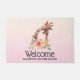 A welcome doormat with a cute drawing in watercolors of a mom and baby giraffe. The mother giraffe is resting her head on top of the baby giraffe, loving and adorable. Pretty pink, yellow, green watercolor flower bouquet placed underneath this darling pair. A gradient background created using a soft pink color blending into light peachy orange color.