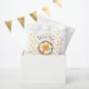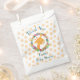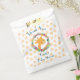 Thank you favor bags for a shower or birthday. Designed with an illustration of a cute smiling giraffe face, surrounded by a wreath of tropical watercolor flowers. Colorful and cute. Background is a faded pattern with orange whimsical spots.