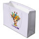 Gift bag with a whimsical watercolor illustration featuring a giraffe face wearing a pretty spring floral crown. Colorful and cute.