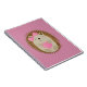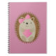 Cute cartoon girl hedgehog wearing a bow and hugging a heart notebook.