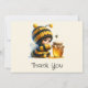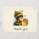Thank you card with a cute image. A girl in a crocheted bee costume with a bee by her side. Watching over a jar of honey.