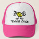 Cute girl's tennis hat gift. Ladies Tennis trucker hat. Customize this ladies tennis hat with your own personalized text or name to make it a special tennis gift. Pink design with cute Tennis Chick ball cartoon.
