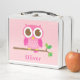 A cute illustration of a pink owl with mini hearts on its belly, is perched on a branch with leaves. Personalize with child's name for an unique lunch box!